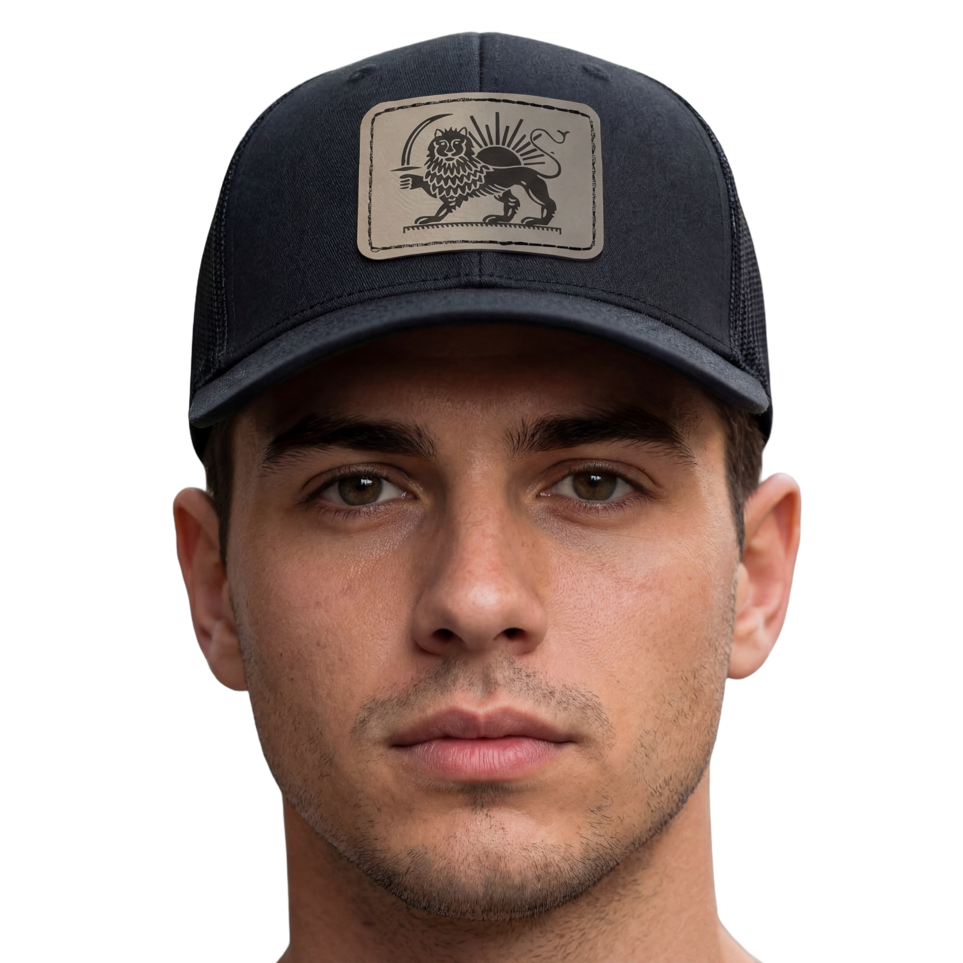 This classic trucker hat features a premium leatherette patch, precision-engraved with the iconic lion and the sun.